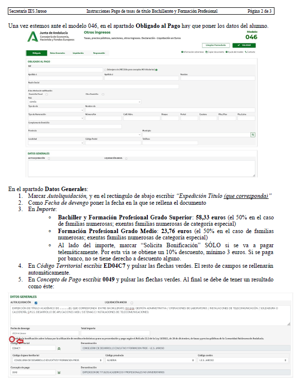 2.- Si no es posible realizar el trámite por la vía anterior, a continuación mostramos las instrucciones para el pago de las tasas de expedición del título de Bachillerato y Ciclos de Formación Profesional de Grado Medio y Grado Superior. Destacamos que por esta vía, una vez pagada la tasa se debe entregar en la Administración/Secretaría del centro el modelo 046, el justificante o validación que acredite su pago y una fotocopia del DNI/NIE por las dos caras del solicitante.